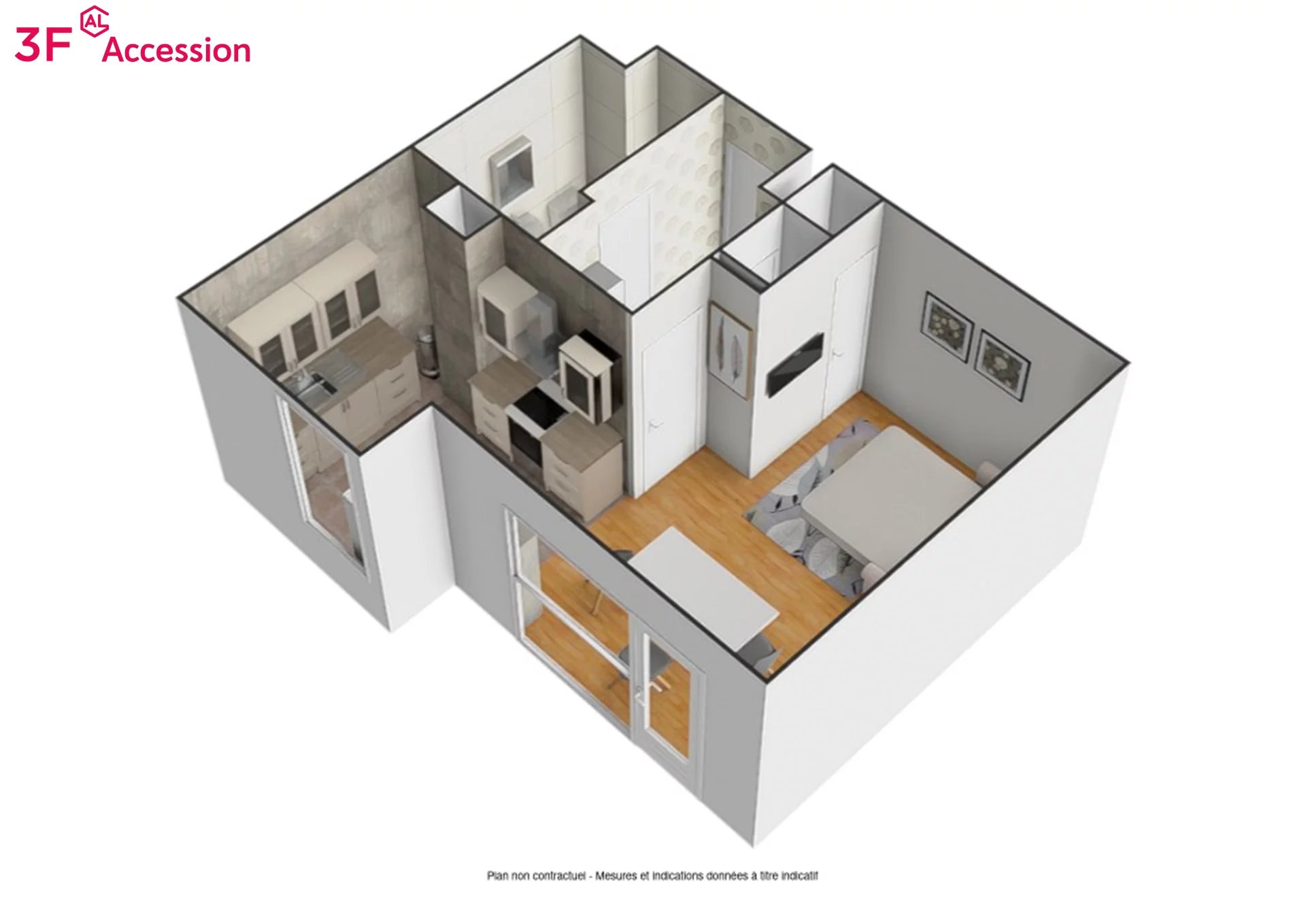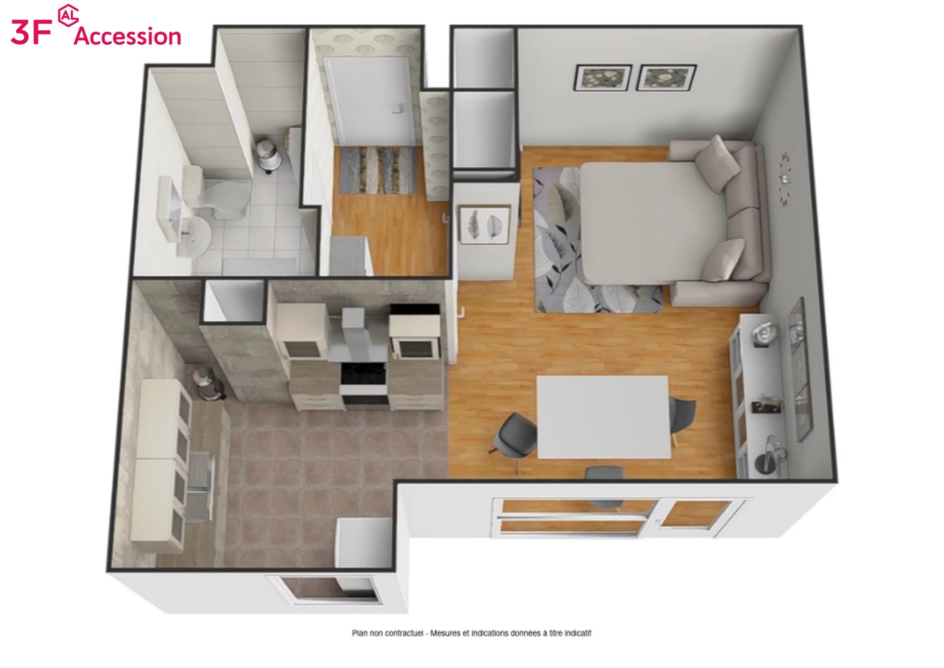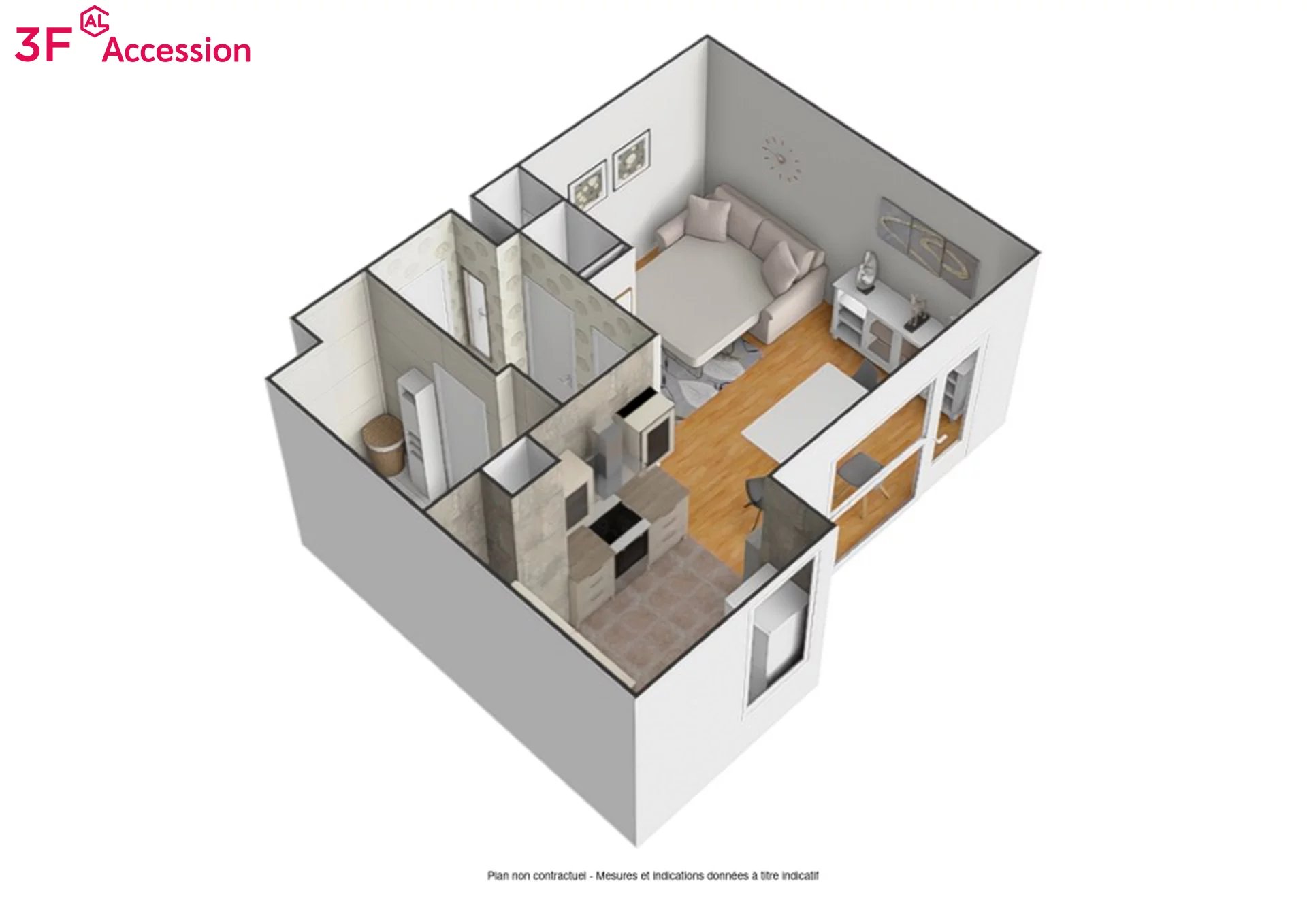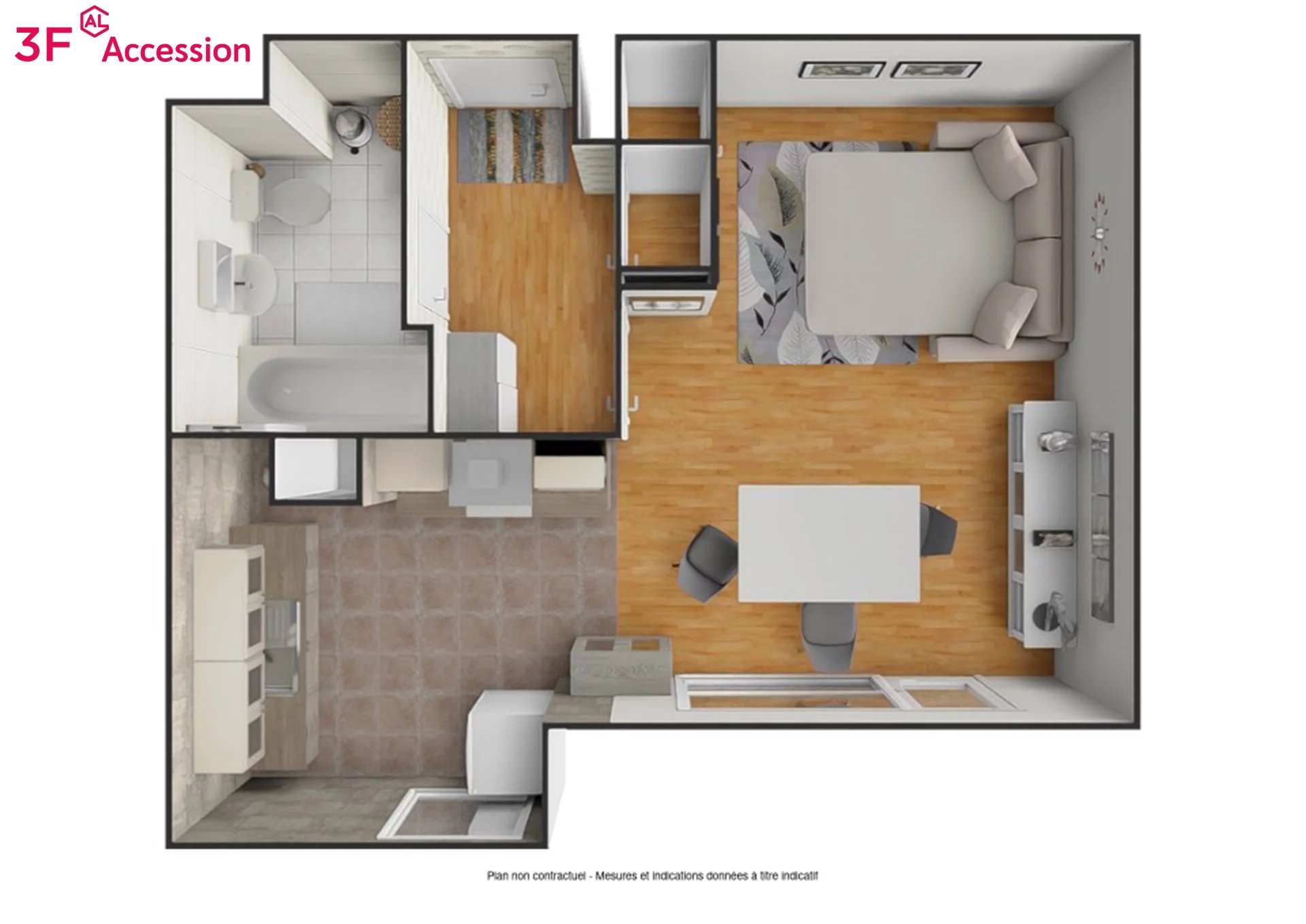 Ce logement comprenant : séjour avec cuisine ouverte, une salle de bain avec W.C, des rangements, un balcon.